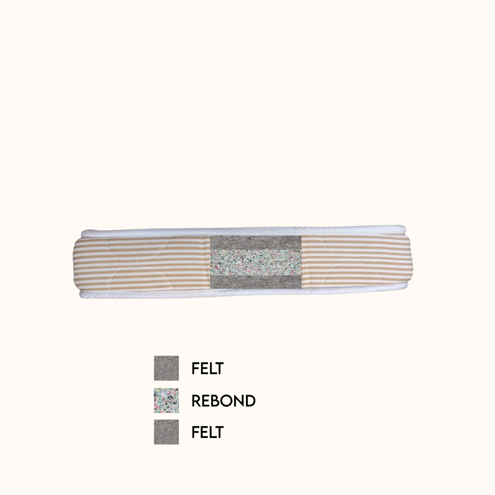 This mattress/pad features a durable, multi-layer construction combining soft yet supportive felt layers sandwiching a resilient rebond foam core. The felt layers provide cushioning and breathability, while the rebond foam offers firm, long-lasting support ideal for maintaining proper body alignment during sleep.